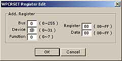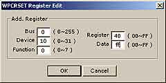 Шаг 6. Запустите теперь WPCRSET. Нажмите кнопку "Add". В появившемся окне введите записанные значения Bus, Dev и Func. В поле Register укажите "40", в поле Data — "FF". Нажмите OK.