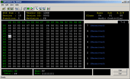 Утилита WPCREDIT позволяет просматривать содержимое регистров любого PCI-устройства. В частности, с ее помощью можно настраивать регистры чипсета и добиваться увеличения производительности. Но в нашем случае она понадобится для анализа регистров звуковой карты и проведения экспериментов по временному "лечению".