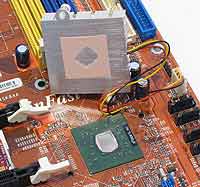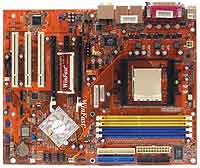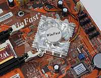 Сокет обрамлен стандартной пластиковой рамкой с прикрепленной к ней с обратной стороны текстолита пластиной, исключающей прогиб. Очевидно, что с установкой на плату типичных кулеров для платформы AMD К8 не должно быть вообще никаких проблем. Но околопроцессорное пространство достаточно свободно и для того, чтобы не возникло вопросов и с монтажом более серьезных девайсов. Инсталляция на плату поистине гигантского охладителя Thermaltake Big Typhoon прошла легко и безболезненно.