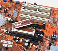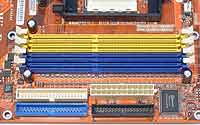 184-контактные 2,5 V слоты DIMM, предназначенные для установки модулей DDR-памяти, вертикально расположены в верхней правой части платы на значительном удалении от первого графического PCI Express x16. Потому их защелки не блокируются установленной видеокартой, которую не придется демонтировать для замены памяти. Разъемы, принадлежащие к первому каналу, выкрашены в желтый цвет, а те, что ко второму — в синий. Даже новичок правильно установит модули. Для охлаждения чипсета используется алюминиевый радиатор с небольшим вентилятором.