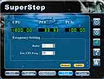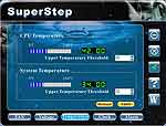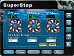 Причем при желании можно изменить значение только одной или нескольких из этих задержек, а для остальных задать автоматическое определение. Напряжение на процессоре можно повысить на 0,02-0,14 V с шагом 0,02 V. Вольтаж на оперативной памяти можно повышать в пределах: от номинальных 2,5 до 2,85 с шагом 0,05 V. Можно было бы посетовать на невозможность увеличения напряжения на чипсете, что иногда помогает достичь стабильности при высоких частотах тактового генератора, но, забегая вперед, скажем, что и без того плата вполне стабильно работала при максимальном клокинге 300 MHz. По мнению автора, для умеренного (разумного) разгона настроек вполне достаточно. В разделе системного мониторинга можно проконтролировать показания встроенных в процессор и материнскую плату термодатчиков, напряжения на процессоре, модулях памяти, батарейке BIOS, линиях +12, +5 и +3,3 V, а также скорости вращения вентиляторов, подключенных к трем разъемам, распаянным на текстолите. Помимо этого, можно установить пороговое значение температуры процессора, по достижении которой производится аварийное отключение системы. Здесь же можно установить специальное значение температуры. До тех пор, пока процессор не разогрелся до этой отметки, охлаждающий его вентилятор будет вращаться на пониженных оборотах. Величину понижения скорости вращения крыльчатки можно задавать в условных единицах от 1 до 5. Вот, собственно, и все пункты, представляющие наибольший интерес. В остальном все настройки, необходимые для конфигурирования устройств, присутствуют в полном объеме. В комплекте с материнскими платами Foxconn поставляется набор фирменных утилит. Многие "молодые" производители в начале своей экспансии на рынок не уделяют этим программам должного внимания, а ведь их возможности зачастую не менее важны, чем некоторые функции BIOS. Модуль SuperStep предлагает пользователю ряд полезных функций. На первой закладке (Fan) доступен контроль скорости вращения вентиляторов, подключенных к трем колодкам, распаянным на текстолите, и установка значений, при которых включается оповещение об остановке крыльчатки.