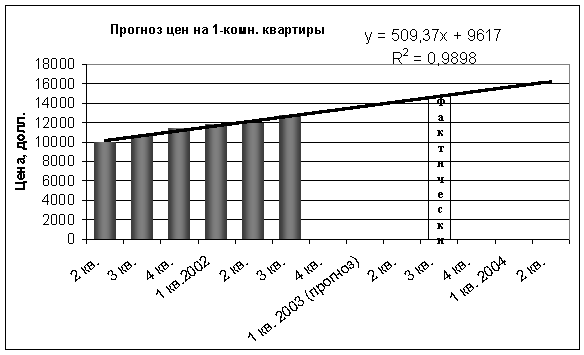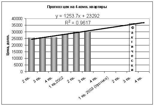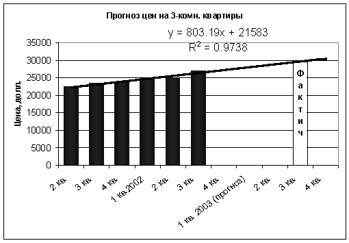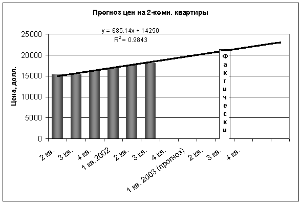 Согласно прогнозам специалистов некоторых агентств недвижимости, цены на квартиры должны были вырасти в 2003 году из-за несбалансированности спроса и предложения до 10% от их стоимости в 2002 году. Данное повышение цен должно было произойти к марту-апрелю 2003 г., а затем рынок недвижимости должен был прийти в норму. Как мы уже знаем, этим прогнозам не суждено было сбыться. В 2003 году мы наблюдали беспрецедентный рост цен за последние несколько лет. Интересен факт, что именно такие закономерности давали нам построенные и опубликованные в 2003 году трендовые модели. Сравним результаты сделанных прогнозов с фактическими данными. Как видно из последующих графиков, совпадение прогноза с фактическими данными почти стопроцентное.