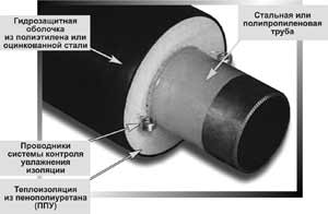Основным теплоизоляционным материалом для прокладок в каналах являлись маты и плиты на основе минеральной ваты (шлаковаты), объем которых достигал 90%. Массовое применение таких способов прокладки и таких теплоизоляционных материалов привело к тому, что 80% тепловых сетей не достигали нормативного срока безаварийной службы, а более 30% тепловых сетей из общей протяженности на сегодня находятся в ветхом состоянии и требуют ремонта (по данным российских экспертов, в РФ это 270 тыс. км в однотрубном исчислении). В некоторых регионах доля изношенных трубопроводов составляет более 50%, в аварийном состоянии — более 25%! Кроме уже упомянутой ускоренной коррозии, такие тепловые сети отличаются повышенными тепловыми потерями. По данным исследований российского института «Теплопроект», проведенных совместно с институтами ВНИПИЭнергопром, НИИМосстрой, АКХ им. Памфилова, ВНИИСТ, ВТИ, через 8 лет эксплуатации тепловые потери теплопроводов с минераловатной изоляцией в непроходных каналах при сезонном обводнении верховодкой (что происходит практически повсеместно) в 2 раза превышают расчетные. К сожалению, никакая гидроизоляция (защитные покрытия из стеклопластиков, гидроизола, полимерных пленок — материалов, кстати, горючих — и тем более штукатурные покрытия), а также гидрофобизация волокнистых материалов не защищает их от увлажнения в период длительной эксплуатации, что и приводит к значительному повышению их теплопроводности. Опыт эксплуатации показывает, что фактический срок службы таких трубопроводов значительно ниже (магистральные сети — 12-15 лет, распределительные и квартальные сети — 7-8 лет) нормативного (25 лет), что увеличивает в несколько раз затраты, приведенные к году эксплуатации. И рано или поздно возникает дилемма: либо без конца тратить средства на поддержание уже имеющихся трасс, либо заменить трубопроводы более эффективными, с большим сроком эксплуатации. Наиболее эффективным решением поставленных выше проблем является широкое внедрение в практику строительства тепловых сетей трубопроводов с пенополиуретановой теплоизоляцией типа «труба в трубе» — они же предизолированные трубы, далее ПИ-трубы. ПИ-трубы обеспечивают следующие преимущества перед существующими конструкциями:
